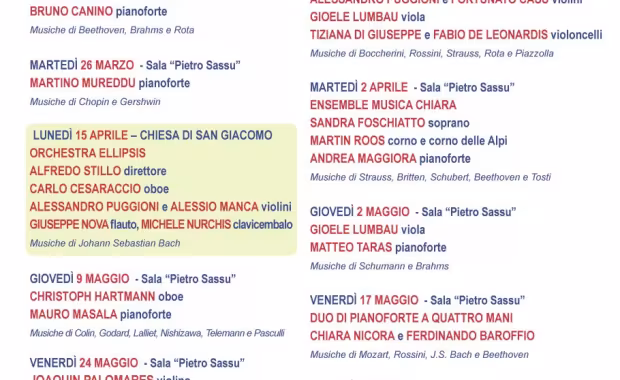 Giovedì 8 marzo alle ore 21 prende il via a Sassari, nella Sala Sassu del Conservatorio di Musica "Luigi Canepa", la 16ma edizione della rassegna "I concerti di primavera", organizzata dall'Associazione Culturale Musicale Ellipsis in collaborazione col Conservatorio di Musica "Luigi Canepa" e col Liceo "Do